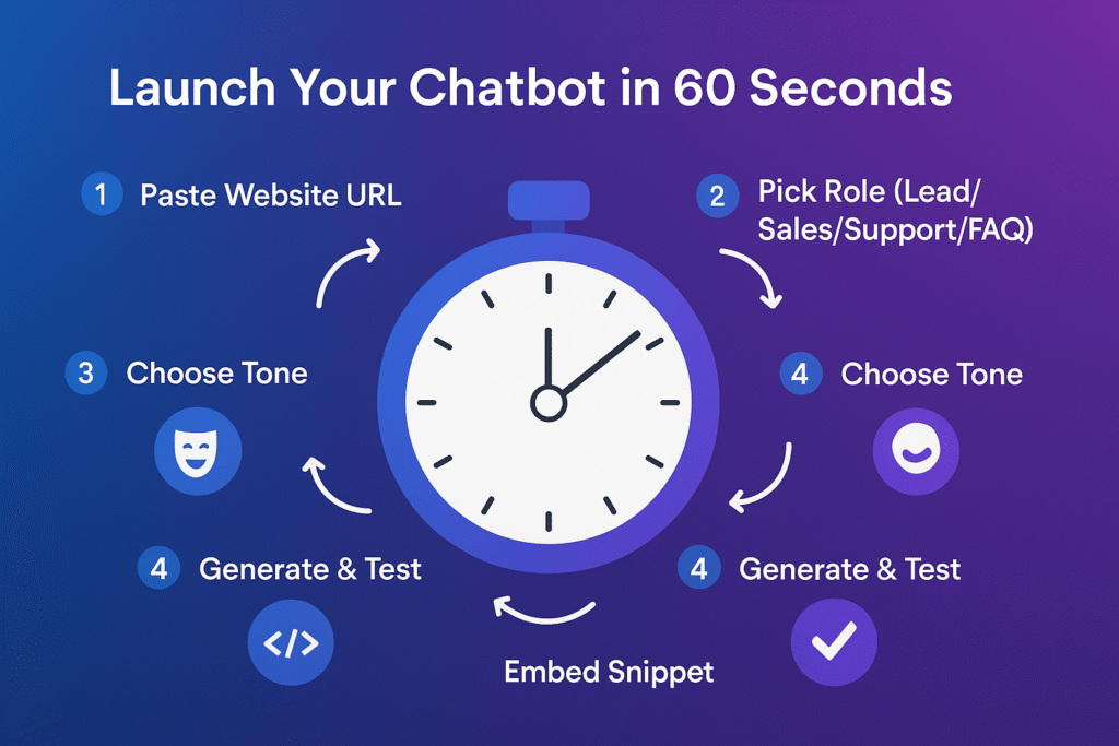 Today, AI has flipped that script. Modern chatbot platforms let you launch a fully functional AI chatbot in under a minute. No code. No developer bottlenecks. Just paste your URL, pick a role, and embed the snippet.