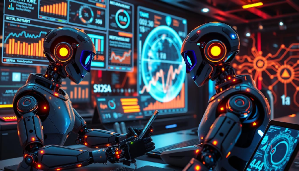 A futuristic AI chatbot surrounded by vibrant digital interfaces, with glowing circuits and holographic displays, depicting customer interactions, in a sleek, modern workspace environment filled with innovative technology.